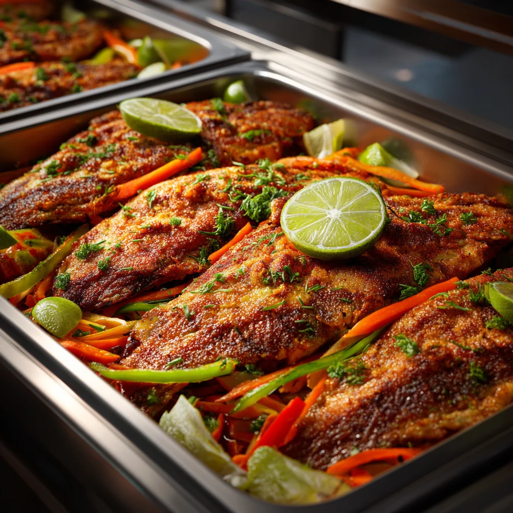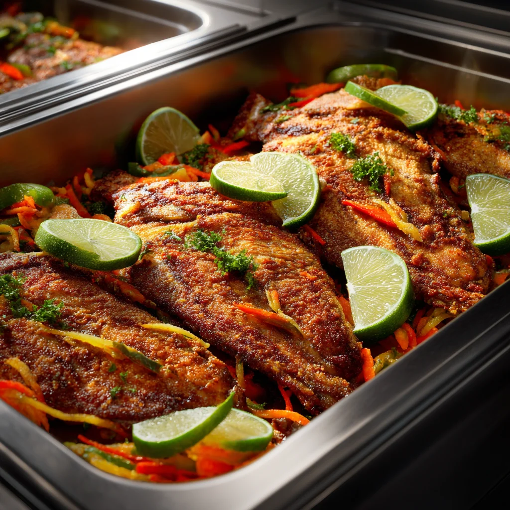 Premium fried snapper fillets. 10-pound catering portion perfect for seafood lovers.