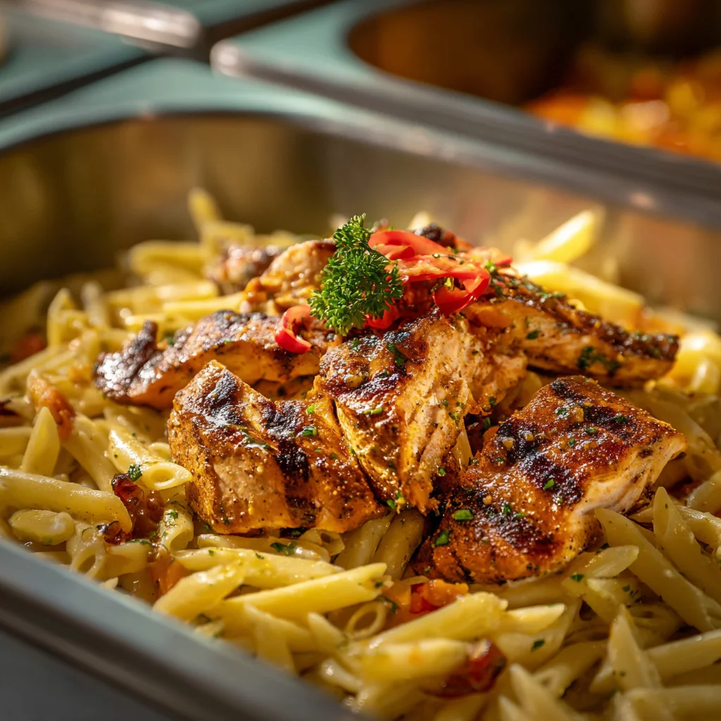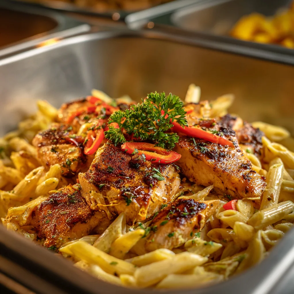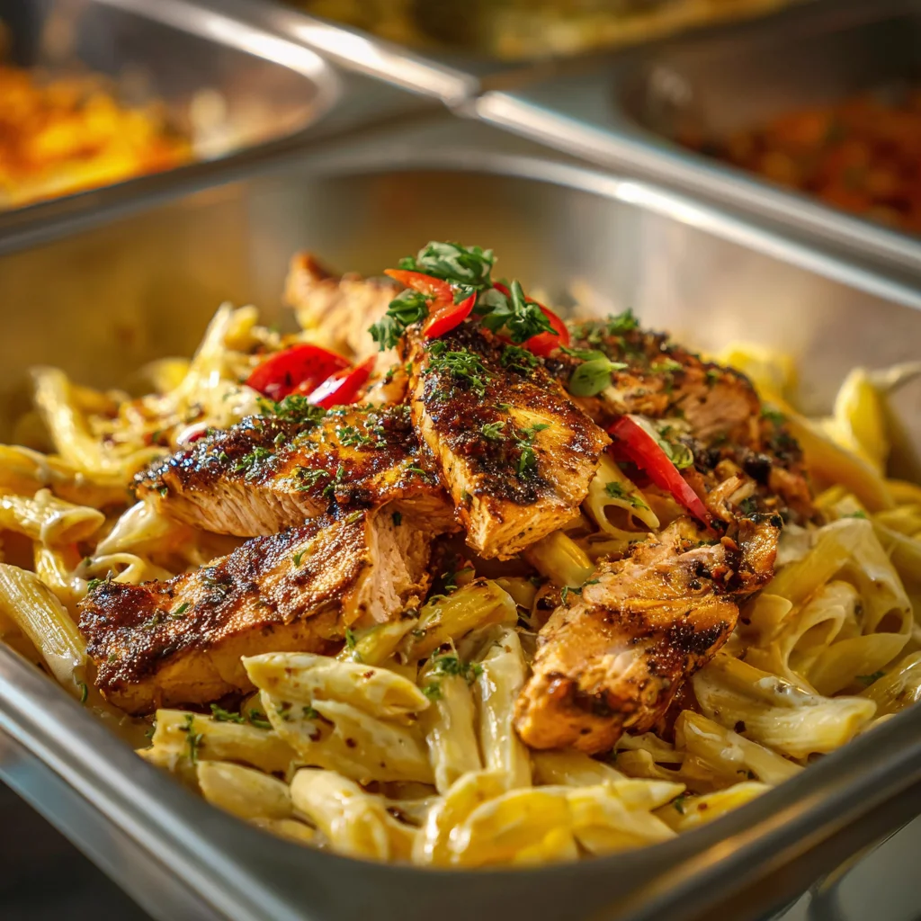 Premium jerk salmon pasta combining fresh salmon with authentic Caribbean jerk spices. Large catering size.